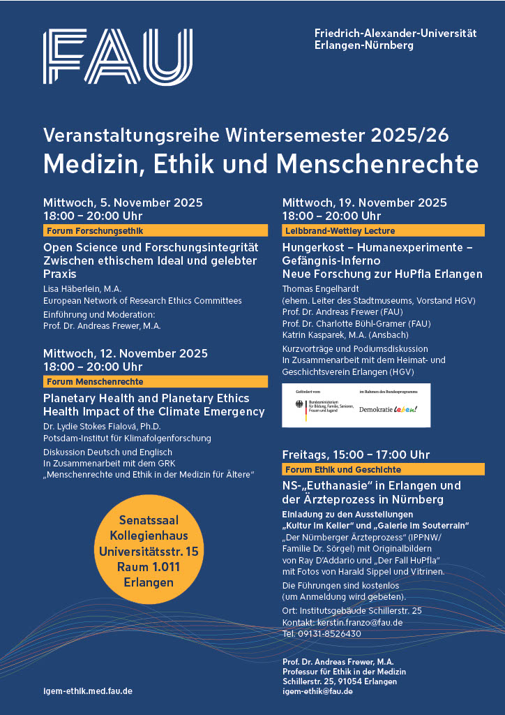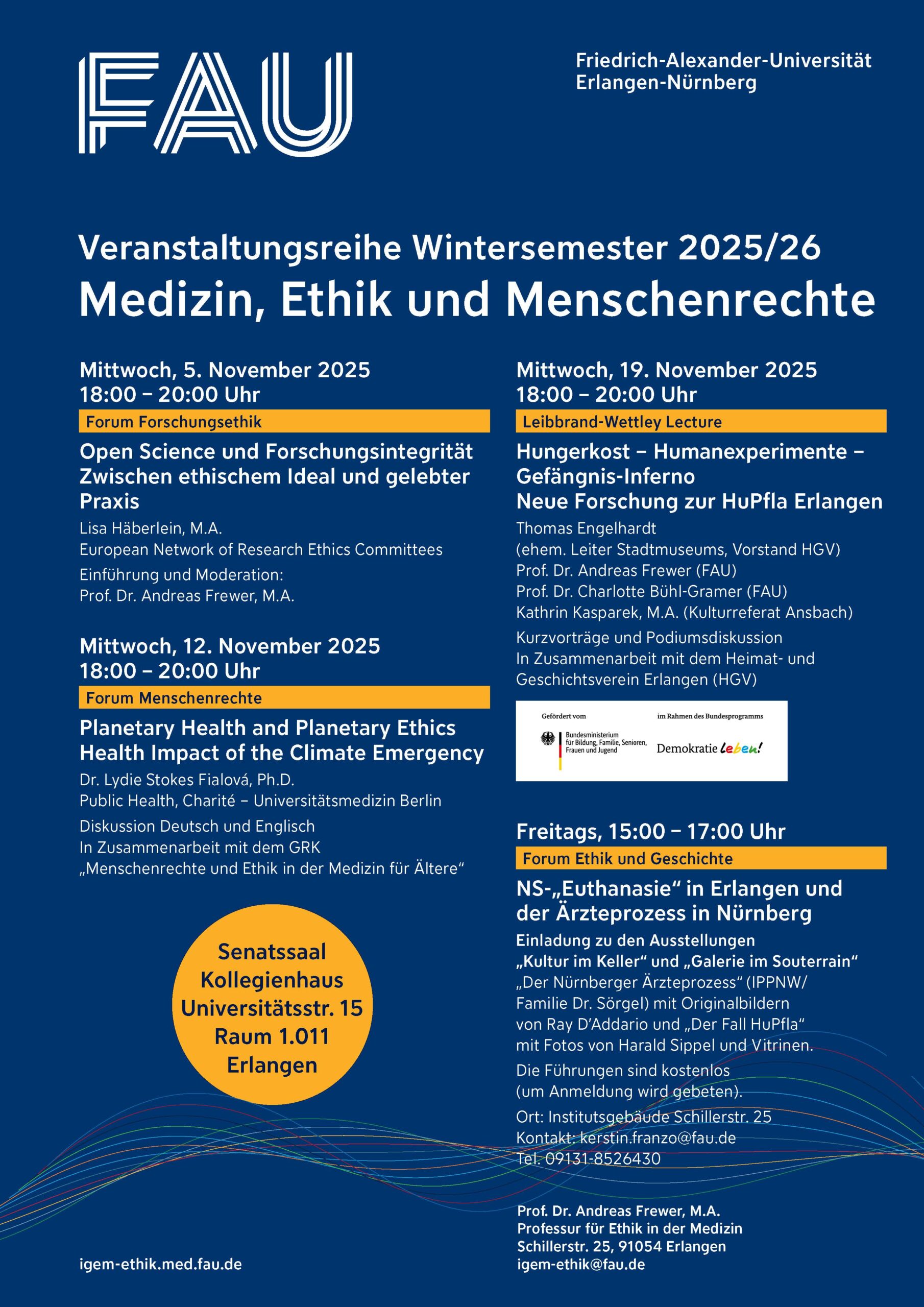 2. Oktober 2025 Veranstaltungsreihe Wintersemester 2025/26 „Medizin, Ethik und Menschenrechte“ 18:00 Uhr, Senatssaal (Raum 1.011) im Kollegienhaus, Universitätsstr. 15 Das Programm mit den einzelnen Vorträgen finden Sie hier. Kategorie: Allgemein, Bühne, Ethik der Medizin, Veranstaltung